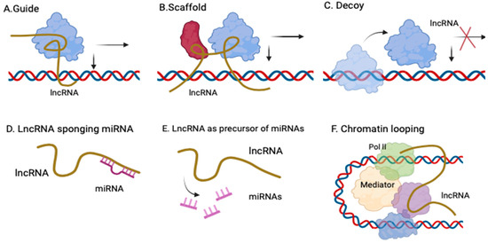 Regulatory mechanisms of lncRNA. (A). Guide lncRNA; (B)—scaffold lncRNA to promote RNP complexes; (C)—lncRNAs bind directly to protein molecules, impairing their functions; (D)—lncRNAs can act as ceRNAs (sponge), reducing effect upon the target mRNA, thereby regulating gene expression; (E)—lncRNA as miRNA precursor—some lncRNAs can act as precursors of miRNAs and modulate their activity; (F)—chromatin looping—lncRNAs serve as bridges to drive inter- or intra-chromosomal interactions.