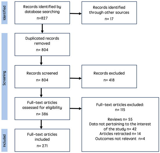 Since medical literature is rich in thousands of lncRNAs studies and gigabytes of data in many databases, we adopted PRISMA guidelines to search for scientific data regarding lncRNAs in the development of ovarian cancer [20]. We registered a search in the PROSPERO database (number: CRD42024611928) to systematize lncRNA data and its influence on survival in ovarian cancer patients. We followed typical steps for scoping and systematic review: identifying the research question, searching for relevant studies, study selection, charting the data, summarizing, and reporting results. We searched through Pubmed, Medline, Web of Science, SCOPUS, and ScienceDirect, using questions: “lncRNA in ovarian cancer”, “lncRNA AND ovarian carcinoma”, and “lncRNA AND epithelial ovarian cancer”. Two independent reviewers screened over 800 positions in databases. After exclusions (review and case report articles, full text unavailable, inappropriate methodology, data not possible to obtain, articles published before 1 January 2020), the last search was performed on 30 July 2024, and over 300 manuscripts were qualified for analysis. Figure 2 shows the results of the search according to the PRISMA 2020 guidelines [30]. According to the scoping nature of the review, no statistical tests were applied at this point of the analysis.