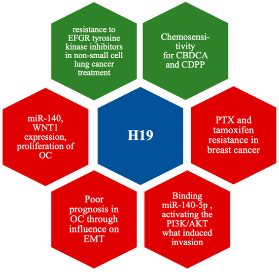 Possible mechanisms of action of upregulated H19 (red) and downregulated (green). Detailed description and abbreviations in text.