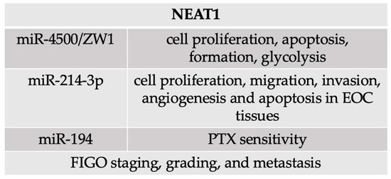 Another well-known lncRNA in the pathogenesis of ovarian cancer is nuclear paraspeckle assembly transcript 1 (NEAT1). Specifically in ovarian cancer, NEAT1 has been shown to interact with biological macromolecules, including chromatin, protein, and RNA, suggesting its potential involvement in regulating gene expression and cellular processes. The work of Xu et al. focused on the oncogenic role of the upregulated NEAT1 in ovarian cancer pathogenesis. Its knockdown significantly inhibited cell proliferation, invasion, and migration compared to the healthy ovarian tissue. Furthermore, a negative correlation was stated between the miR-4500 and NEAT1 expressions; this relationship influenced multiple cell functions, including cell proliferation, apoptosis, formation, glycolysis, etc. This study also described the BZW1 (basic leucine zipper and W2 domain-containing protein 1) as directly targeted by miR-4500 [216].