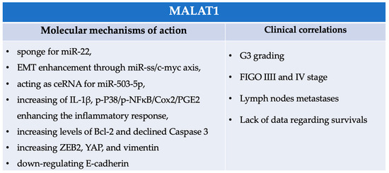 Similar results were supported by Wu et al., who analyzed MALAT1 also in terms of clinicopathological characteristics, as it was reported that high MALAT1 expression was associated with advanced histological grade (G3, p < 0.001), higher FIGO stages (III-IV, p = 0.001), as well as the presence of lymph node metastases (p < 0.0001). Further analysis showed that the exogenous knockdown of MALAT1 inhibited the proliferation and migration of EOC, inducing apoptosis in EOC in vitro [310]. Likewise, Qiu et al. determined the high correlation between the serum exosomal, MALAT1 levels in EOC, and clinicopathological variables such as FIGO stage (p < 0.001) or lymph node metastases (p = 0.0020). Moreover, upregulated MALAT1 was determined to promote and regulate the angiogenesis in EOC [311]. Interesting results were published by Sun et al., who supported the idea that MALAT1 regulates EOC proliferation. In this study, upregulated MALAT1 correlated negatively, acting as ceRNA for miR-503-5p. Its knockdown resulted in an increased cell apoptosis inhibition as well as the inhibition of the JAK2/STAT3 signal pathway [59]. According to Mao et al., higher MALAT1 expression contributed to the resistance of PTX and CDDP in vitro. Overexpressed MALAT1 caused a significant increase in IL-1β, p-P38/p-NFκB/Cox2/PGE2 enhancing the inflammatory response. Increased levels of Bcl-2 and declined Caspase 3 levels were responsible for inhibiting cell apoptosis. In contrast, increased ZEB2, YAP, and vimentin with parallelly downregulated E-cadherin caused the amplification of EMT in EOC cells. This study also described that overexpression of MALAT1 in ovarian cancer-associated fibroblasts (CAFs) enhances the invasiveness of the cells [200]. In Figure 6, we summarized the MALAT1 molecular mechanisms.