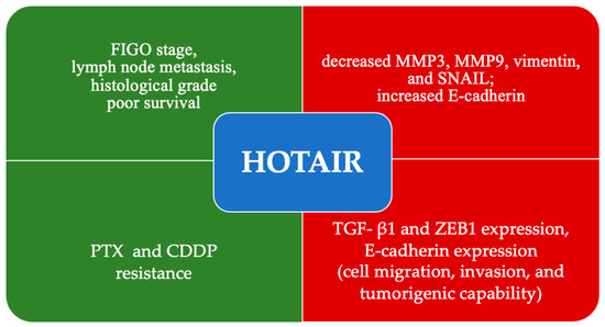Presented lncRNAs are involved in many vital processes: cell cycle regulation, invasion, proliferation, migration, and apoptosis, and they promote epithelial-to-mesenchymal transition and resistance to chemotherapy. High expression levels of some lncRNAs are correlated with clinicopathological features such as tumor stage, FIGO classification, poor prognosis, and overall survival rate [79,89,119,147,152,240].