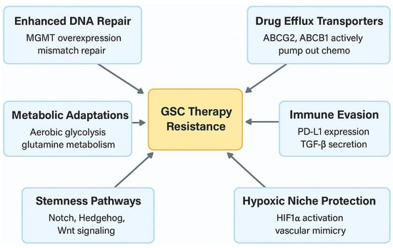 GBM cells exhibit intrinsic and acquired resistance to temozolomide and radiotherapy []. The expression of O6-methylguanine-DNA methyltransferase (MGMT), which repairs temozolomide-induced DNA damage, is a well-known mechanism of chemoresistance []. Methylation of the MGMT promoter correlates with better responses to temozolomide, but this occurs in only a subset of patients []. Enhanced DNA damage repair pathways, activation of survival signaling, and hypoxia-induced radioresistance contribute to the limited efficacy of radiotherapy [].