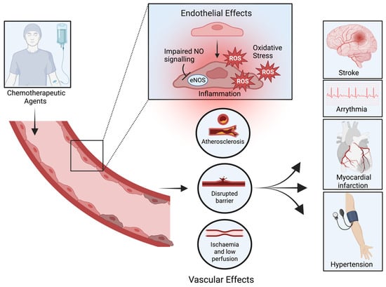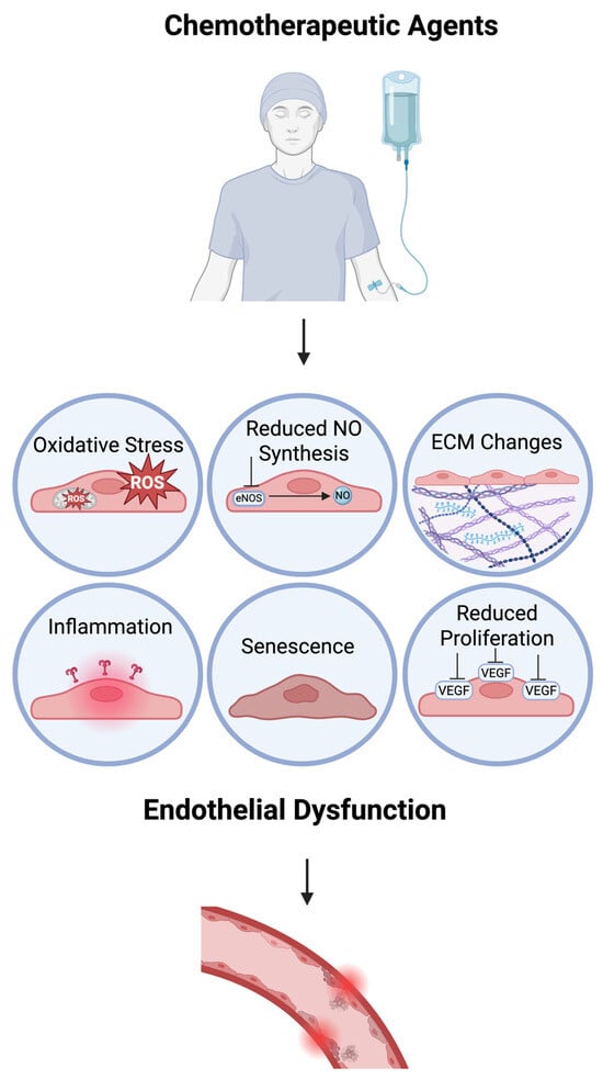 Chemotherapeutic agents can damage endothelial cells and impair function. This occurs through both direct and indirect processes. Core mechanisms include oxidative stress, inflammation and cytokine release, the reduced synthesis of NO due to the inhibition of endothelial eNOS, cellular senescence, reduced proliferation due to VEGF inhibition, and ECM changes.