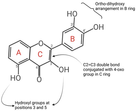 Flavonoids (Figure 3) are polyphenolic compounds composed of two aromatic rings linked by a three-carbon bridge, typically forming an oxygen-containing heterocyclic ring. This structure provides a site for radical incorporation and imparts electrophilic properties, serving as the basis for various flavonoid subtypes with diverse biological activities [111]. Based on their structural characteristics, flavonoids are categorised into six subtypes: anthocyanins, flavones, flavanols, isoflavones, flavanols, and flavanones [112].