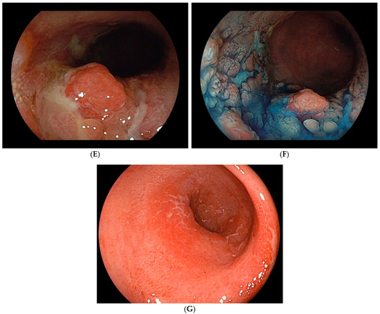 UCAN exhibits various morphological types, including polypoid, superficial, and mixed (unclassifiable) forms (Figure 1A–G). The Surveillance for Colorectal Endoscopic Neoplasia Detection and Management in Inflammatory Bowel Disease Patients: International Consensus Recommendations (SCENIC) guidelines propose a macroscopic classification system that categorizes lesions as either polypoid dysplasia (pedunculated or sessile) or nonpolypoid dysplasia (superficial elevated, flat, or depressed), with additional descriptors for ulceration and lesion margin clarity [37]. Polypoid lesions, such as pedunculated or subpedunculated types, are rare in UCAN. More commonly, lesions exhibit granular elevations with indistinct margins and a villous surface structure [38]. High-grade dysplasia with a flat or depressed morphology often appears as a well-demarcated erythematous area [39]. Careful observation of surface structure and color changes after indigo carmine staining enhances the visibility of the lesion’s macroscopic features and boundaries, making chromoendoscopy a recommended adjunctive diagnostic method [38].