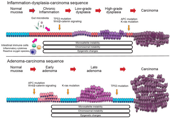 Comparison of the molecular mechanisms in colorectal cancer. (Upper) The molecular mechanism of the inflammation–dysplasia–carcinoma sequence, which is characterized by TP53 mutations in the early stages, and APC and K-ras mutations in the later stages. (Lower) The molecular mechanism of the adenoma–carcinoma sequence, which is characterized by APC and K-ras mutations in the early stages and TP53 mutations in the later stages.
