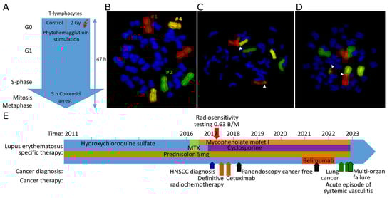 Fluorescence in situ hybridization and analysis of chromosomal aberrations scored as breaks per metaphase. (A) Scheme of treatment and stimulation of ex vivo blood for irradiation and generation of chromosomal aberrations. (B) Metaphase with red-stained chromosome #1, green chromosome #2, and yellow chromosome #4. (C) Chromosomes #1 and #2 involved in a translocation. (D) Chromosomes #1 and #2 involved in a dicentric aberration and an acentric. Translocations and dicentric aberrations are counted as two breaks per metaphase each. Break positions are marked by white arrowheads. (E) Treatment regimen of a radiosensitive patient with SLE. Timeline of SLE treatment (writing on the arrow) and treatment of an HNSCC and lung cancer (below the arrow).