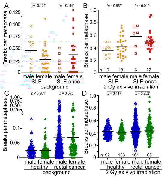 Relationship of radiation sensitivity to sex in the healthy, rectal cancer, and SLE cohorts. (A) Background values for breaks per metaphase in the cohort of 37 individuals with SLE and 28 individuals with SLE and cancer separated by sex. (B) Radiosensitivity after 2 Gy of ex vivo irradiation in the cohort of 37 individuals with SLE and 28 individuals with SLE and cancer separated by sex. (C) Background values for breaks per metaphase in the cohort of healthy subjects and rectal cancer patients divided by sex. (D) Radiosensitivity after 2 Gy of ex vivo irradiation in the cohort of healthy subjects and rectal cancer patients divided by sex. The blue long dashed horizontal line depicts the mean background breaks per metaphase of the healthy subjects and the green long dotted line the background breaks of the rectal cancer patients. The red long dashed horizontal line represents the mean number of breaks per metaphase for both healthy and rectal cancer subjects. The mean values are represented by the black short horizontal lines.