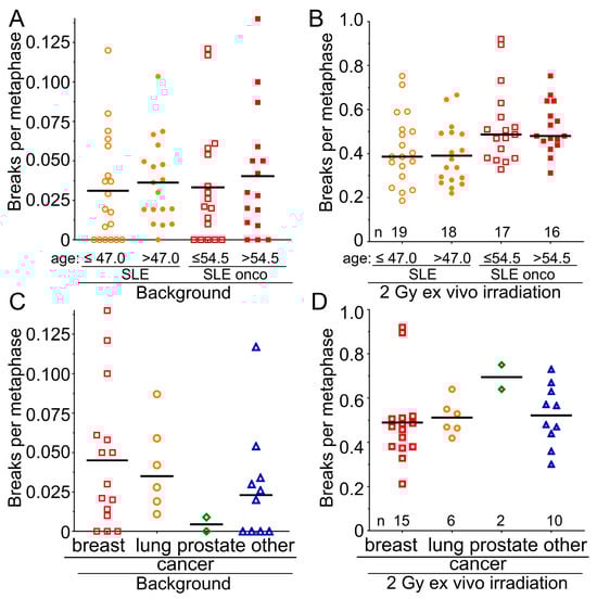 Dependency of radiation sensitivity on the age and the type of tumor in the SLE cohorts. (A) Background values for breaks per metaphase in the cohort of 37 individuals with SLE, separated by median age, younger than or equal to 47.0 years, and older than 47.0 years, and in the oncologic SLE cohort of 28 individuals, separated by median age, younger than or equal to 54.5 years. (B) Radiosensitivity after 2 Gy of ex vivo irradiation and according to the previous separations. (C) Background values for breaks per metaphase in the SLE-oncology cohort of 28 individuals, separated by breast, lung, prostate, and other cancers. (D) Radiosensitivity after 2 Gy ex vivo irradiation in the SLE-oncology cohort of 28 subjects, separated by breast, lung, prostate, and other cancers.