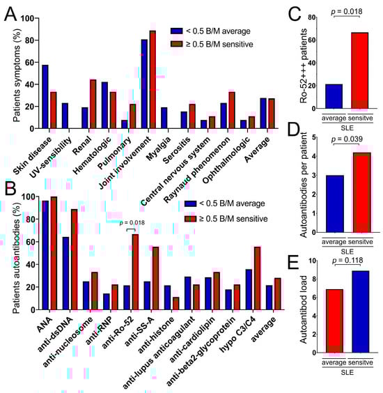 Antibodies and symptoms in the non-oncologic SLE cohort of 8 patients with increased radiosensitivity (red bars) were compared to the 29 patients with average radiosensitivity (blue bars). (A) Various symptoms of SLE in the average and in the sensitive group. (B) Various autoantibodies in the average (blue bar) and in the sensitive group (red bar). (C) Ro-52 strongly positive patients in the average and in the sensitive group. (D) Average number of autoantibodies per patient in the average and in the sensitive group. (E) Autoantibody load in the average und in the sensitive group.