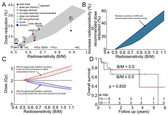 Radiation sensitivity in patients with systemic lupus erythematosus. (A) Fifteen patients with increased radiation sensitivity. Patients were recommended for dose reduction in the area of the gray envelope. Red diamond = dose per fraction was reduced at the given percentage, blue diamond = total dose was reduced at the given percentage, vertical blue line indicates that the dose per fraction and the total dose were reduced differently for the patient, orange dot = radiotherapy was aborted after 28 Gy due to exacerbation of SLE, green diamonds = dose was not reduced, blue cross = intended radiotherapy was not performed, blue circle = acute side effect occurred, blue dot = chronic side effect occurred. Cancer type and the intended dose (Gy) are indicated above each patient. BC = breast cancer, AC = anal carcinoma, LC = lung cancer, SCLC = small cell lung cancer, PCa = prostate cancer, HNSCC = head and neck squamous cell carcinoma, THYM = Thymoma, CLL = chronic lymphatic leukemia, EWS = Ewing’s sarcoma. (B) Empirically determined correlation between radiation sensitivity and increased radiation sensitivity in percent or recommended dose reduction with the estimated range of uncertainty (blue area). (C) The increased effect of a 2 Gy fraction is expected from the increased radiation sensitivity (red lines, dotted line mean value, solid line uncertainty range). The required reduction of a 2 Gy fraction at an increased radiation sensitivity to achieve an effect equivalent to the 2 Gy fraction (blue lines, dotted line mean value, solid line uncertainty range). (D) Kaplan–Meier plot of overall survival in 23 patients with systemic lupus erythematosus and concomitant oncologic disease. Overall, 10 patients with an increased radiosensitivity greater than 0.5 B/M were compared with 13 patients with average radiosensitivity.