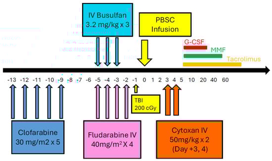 - Naik, S.; Rakszawski, K.; Zheng, H.; Claxton, D.; Minagawa, K.; Mineishi, S. Clofarabine Preconditioning followed by Allogeneic Transplant Using TBI and Post-Transplant Cyclophosphamide for Relapsed Refractory Leukemia. Int. J. Mol. Sci. 2024, 25, 957. [Google Scholar] [CrossRef]