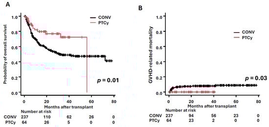 - Broers, A.E.C.; de Jong, C.N.; Bakunina, K.; Hazenberg, M.D.; van Marwijk Kooy, M.; de Groot, M.R.; van Gelder, M.; Kuball, J.; van der Holt, B.; Meijer, E.; et al. Posttransplant cyclophosphamide for prevention of graft-versus-host disease: Results of the prospective randomized HOVON-96 trial. Blood Adv. 2022, 6, 3378–3385. [Google Scholar] [CrossRef]