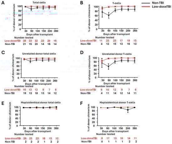 - Shah, N.; Cioccio, J.; Rakszawski, K.; Zheng, H.; Nickolich, M.; Naik, S.; Wirk, B.; Rybka, W.; Ehmann, C.; Silar, B.; et al. Low-dose total body irradiation promotes T-cells donor chimerism in reduced-intensity/non-myeloablative allogeneic stem cell transplant with post-transplant cyclophosphamide. Leuk. Res. 2022, 123, 106969. [Google Scholar] [CrossRef]
