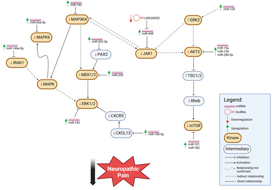 Figure 1. Upregulation of miRNA, via kinase mediation, alleviates neuropathic pain. The upregulation of miRNAs is indicated by an upward green arrow. Reduction in kinase activities or expression levels, which is the case for all kinases directly or indirectly impacted by miRNA, is marked by a downward red arrow, except for GRK2, which shows increased levels with miRNA upregulation with an upward green arrow. Additionally, TSC1/2, an intermediary protein, is also upregulated in this motif. The outcome of all indicated changes in miRNA or other factors’ levels is the alleviation of neuropathic pain.