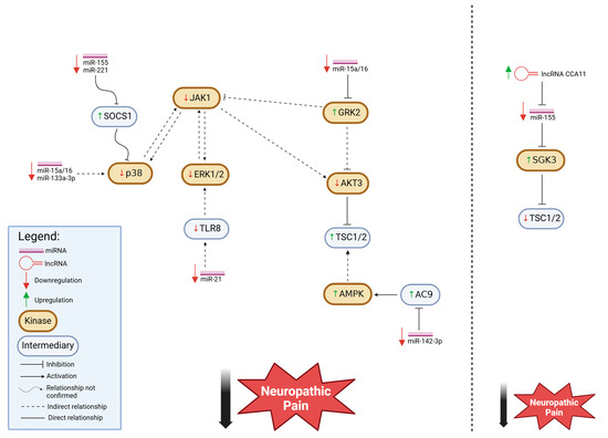 In the neuropathic pain model of SNL in rats, decreased levels of the lncRNA (long non-coding RNA) LINC00052 (long intergenic non-coding RNA 00052) have been found to increase levels of miR-448 [51], leading to decreased JAK1 levels and attenuated neuropathic pain.