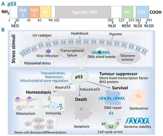 The structure of the tumor suppressor gene p53 is depicted in Figure 1A. It comprises two adjacent transcription activation domains (TADs), referred to as TAD1 and TAD2, located at the N-terminus. TAD2 overlaps with a proline-rich domain, which is vital for apoptosis and the stabilization of p53 function [1]. The central or “core” domain contains the sequence-specific DNA-binding region of p53, which is crucial for the transcriptional activation of certain genes and tumor suppression. The C-terminal region includes sequences required for nuclear localization, non-specific DNA binding, and regulatory functions [2,3].