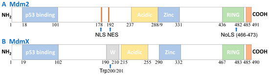The structure of MdmX, a homolog of Mdm2, is shown in Figure 2B. MdmX lacks E3 ligase activity in its RING domain and does not directly induce p53 degradation. However, it interacts with Mdm2 through its RING motif, and this interaction regulates the levels of both p53 and Mdm2 [12].
