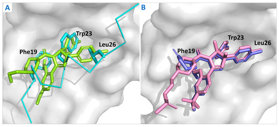 Comparison of the crystal structures of Mdm2 complexes with their different ligands. (A) Comparison of the binding modes of Nutlin-2 (green) and p53p (cyan) with Mdm2 proteins (PDB ID: 1RV1 and 1YCR); (B) Comparison of the binding modes between Nutlin-3a (purple) and RG7112 (pink) with Mdm2 proteins (PDB ID: 4J3E and 4IPF).