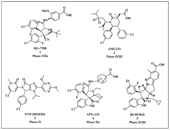 Most Mdm2 inhibitors have shown limited efficacy in Phase I trials, with significant thrombocytopenia emerging as a dose-limiting toxicity linked to prolonged Mdm2 inhibition (Table 1). Nonetheless, several small-molecule Mdm2 inhibitors are currently undergoing Phase II/III clinical trials for the treatment of WTp53 tumors, as shown in Figure 5.