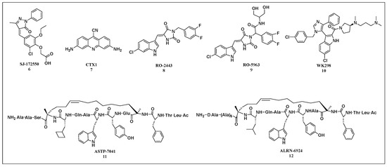 Mdm2 and its homolog MdmX are negative regulators of p53, sharing similar structural domains. Mdm2 inhibitors, designed by mimicking the interaction with key amino acid residues of p53, could, in theory, also inhibit MdmX. However, most existing Mdm2 inhibitors exhibit relatively weak binding affinity for MdmX. Only a few p53-MdmX inhibitors have been reported, including SJ-172550, CTX1, RO-2443, RO-5963, WK298, ATSP-704, and ALRN-6924 (Figure 6).