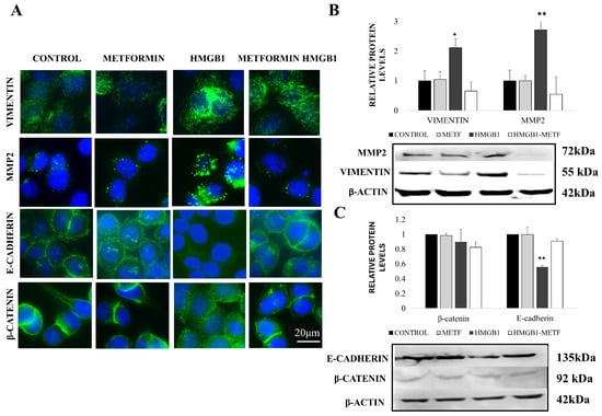 Cells were seeded onto glass coverslips in 24-well plates. The next day, they were treated with 800 ng/mL HMGB1 or 1 mM metformin (for MDA-MB-468 cells) or 3 mM metformin (MDA-MB-231 cells) for 24 h. The samples were washed with PBS, fixed in 4% paraformaldehyde for 20 min, and then permeabilized with 0.1% Triton X-100 (Cat# T9284, Sigma-Aldrich, St. Louis, MO, USA) in PBS. Then, the cells were incubated with blocking buffer (10% fetal calf serum, 1% BSA, and 0.1% Triton X-100 in PBS) for 1 h. After that, the coverslips were incubated with the primary antibodies at 4 °C overnight. The following antibody dilutions were used: Anti-RAGE antibody (Cat# ab216329, Abcam, Cambridge, MA, USA) 1:400; Anti-Vimentin (D21H3) XP® Rabbit mAb (Cat# 5741, Cell Signaling Technology, Danvers, MA, USA) 1:200; Anti-β-Catenin Antibody (Cat# 9562, Cell Signaling Technology, Danvers, MA, USA) 1:200; Anti-NF-κB p65 (D14E12) XP® Rabbit mAb (Cat# 8242, Cell Signaling Technology, Danvers, MA, USA) 1:200; and MMP-2 (D4M2N) Rabbit mAb (Cat# 40994, Cell Signaling Technology, Danvers, MA, USA) 1:500. After washing with PBS, the coverslips were incubated with secondary Alexa Fluor 488 Polyclonal Antibody (Cat# A-11094, Invitrogen™, Thermo Fisher Scientific, Waltham, MA, USA) for 1 h at 37 °C. After two washes in PBS, the coverslips were rinsed in ddH2O and briefly dipped in 100% EtOH. After a quick dry, the coverslips were mounted on a slide with Fluoromount-G™ Mounting Medium (Cat# 00-4958-02, Invitrogen™, Thermo Fisher Scientific, Waltham, MA, USA) containing 400 ng/mL DAPI. Images were taken using an epifluorescence microscope Zeiss AxioVert 200 M (Zeiss, Oberkochen, Germany) using a 63× objective.