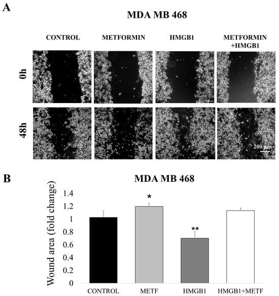 Effect of metformin (METF) on HMGB1-induced migration of breast cancer cells. (A) Representative pictures of wound closure in MDA-MB-468 cells treated with 800 ng/mL HMGB1 and/or 1 mM metformin at 0 h and 48 h. (B) Quantification of wound healing. Data represent means ± SD; * p < 0.05 and ** p < 0.01 vs. control.