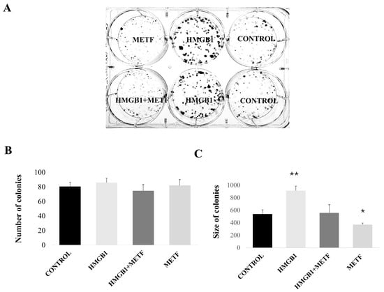 Effect of metformin (METF) on HMGB1-induced proliferation of breast cancer cells. (A) Representative images of clonogenic assay with MDA-MB-231 cells. (B) Number of colonies. (C) Size of colonies. Data represent mean ± SD (n = 3); * p < 0.05, ** p < 0.01, vs. control.