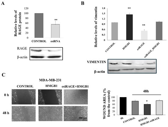 Vimentin protein levels were compared between the control and RAGE-silenced MDA-MB-231 cells. RAGE silencing led to a decrease in vimentin levels (Figure 5B). Stimulation of the silenced cells with 800 ng/mL HMGB1 increased vimentin protein expression, but this increase was significantly less than in cells with normal RAGE levels (Figure 5B). The stimulatory effect of HMGB1 on cell migration was also abolished in RAGE-silenced cells (Figure 5C).