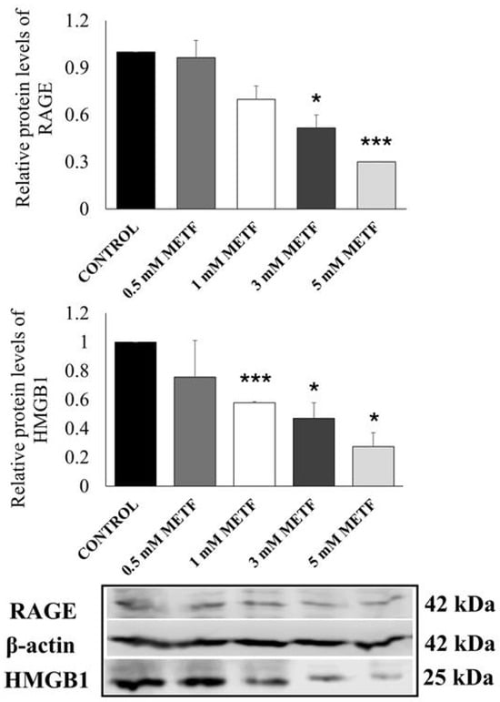 Protein expression levels of HMGB1 and RAGE in MDA-MB-468 cells treated with increasing concentrations of metformin (METF). Data are given as mean and SD. Asterisks indicate a significant difference; * p < 0.05, *** p < 0.001 vs. control.