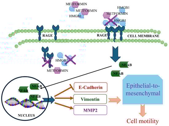In addition to its effects on NF-κB, metformin also impacted the expression of matrix metalloproteinase-2 (MMP-2), a protein associated with tumor invasion [47]. Increased expression of MMP-2 in response to HMGB1 has been previously documented in lung cancer cells, and this expression was significantly reduced by NF-κB inhibition [48]. Consistent with these findings, our data showed that metformin diminished HMGB1-induced MMP-2 upregulation, suggesting that metformin’s inhibitory effect extends to critical downstream molecules involved in cancer metastasis (Figure 7).