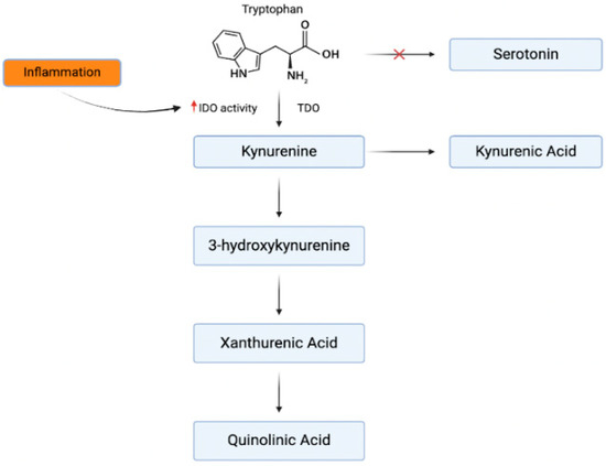 Inflammatory effects on tryptophan metabolism. The kynurenine pathway originates from the same precursor amino acid as serotonin. In times of inflammation, the effects of IDO are amplified and shift tryptophan [43].