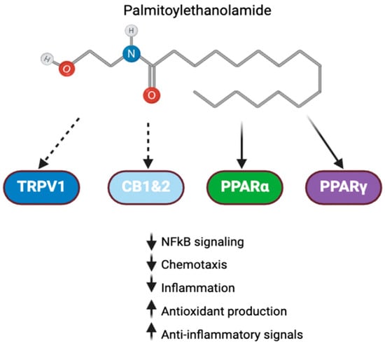 PEA signaling in inflammation. Palmitoylethanolamide interacts with a number of receptors involved in inflammation. Direct activity with PPAR and indirect activity with cannabinoid receptors and TRPV1 allow it to exert anti-inflammatory effects [84].
