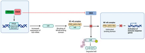 PPAR-dependent NF-κB pathway suppression. In addition to the direct inhibition of IKK-induced activation of NF-κB, PPAR complexes with RXR, which allows for interfacing with the response elements in the nucleus and upregulates the transcription of IkB mRNA. The increase in IkB results in the blocking of active regions in the NF-κB complex and preventing pro-inflammatory signaling [86].