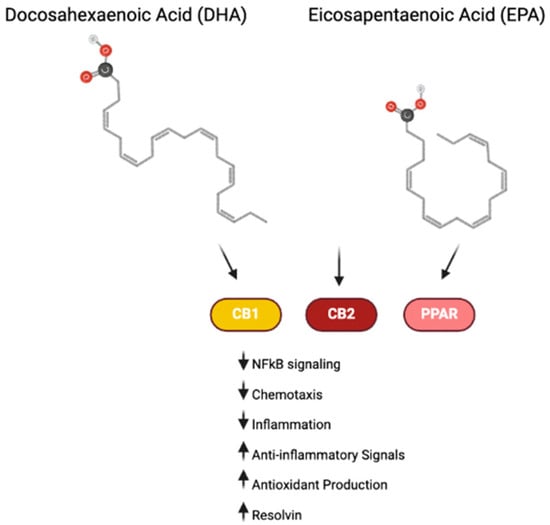 Through these mechanisms, omega-3 FAs and their derived eCBs have demonstrated anti-inflammatory properties. Research has shown that EPA-EA can lead to a dose-dependent reduction in IL-6 and an increase in IL-10 [103]. Additionally, omega-3 FAs have been reported to lower levels of TNF-α, a key inflammatory mediator [104].