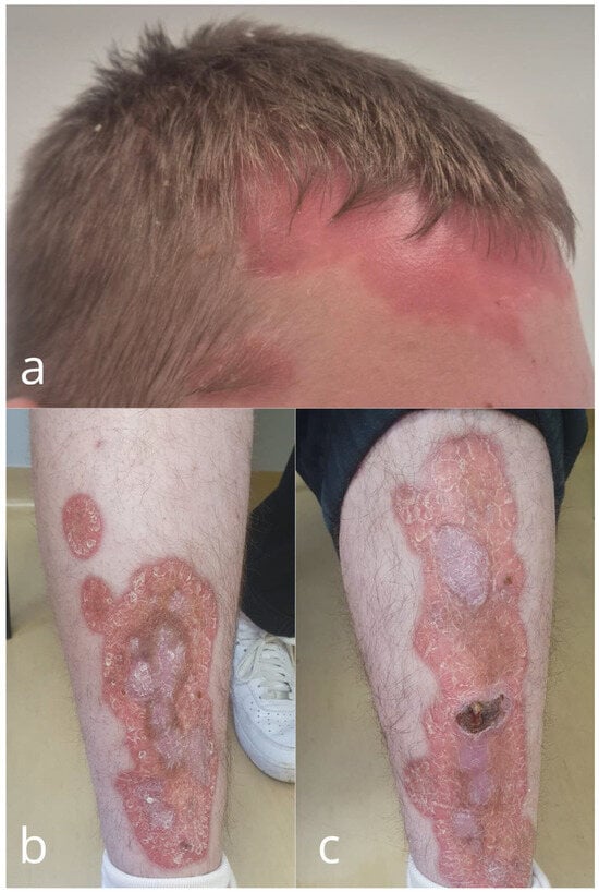 Clinical presentation of the patient: typical psoriatic lesions on the scalp and face, accompanied by erythematous plaques on the lower legs combining clinical features of both psoriasis and necrobiosis lipoidica [8,9]. (a) erythematous and desquamative plaques on the scalp and forehead; (b) right leg, extensive erythematous plaques with a sharp, slightly elevated border and central atrophy covered with silvery scale; and (c) a superficial ulceration in the central part of the plaque on the left leg.