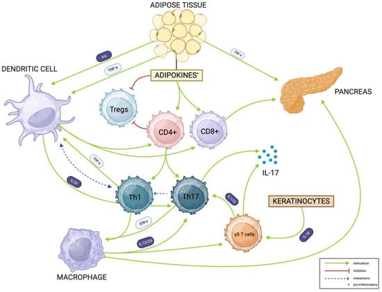 Excessive adipose tissue constitutes major source of proinflammatory cytokines, including TNF-α, IL-6, leptin, and resistin, which promotes naïve CD4+ lymphocyte differentiation toward Th1 and Th17 subtypes. In the initial phase of psoriasis pathogenesis, activated dendritic cells and macrophages release IL-23, which promotes Th17 differentiation. IL-6 and TNF-α released from adipocytes enhance dendritic cells’ interactions with lymphocytes. Moreover, IL-23 together with IL-1β derived from keratinocytes shift cytokine profile produced by γδ T cells towards IL-17A/F. γδ T cells become the main source of IL-17 in autoimmune diseases. Moreover, they produce IL-1 and IL-22, which augment Th17 differentiation and further IL-17 release. IL-17 is responsible for epidermis thickening characteristic of psoriasis and sustaining chronic inflammation seen in psoriasis and T1DM. The role of Th1 cells in psoriasis pathogenesis includes influence on dendritic cells mediated by TNF-α and macrophage activation by IFN-γ. T1DM is initiated by the processing of pancreatic β cell autoantigens by dendritic cells, which then present them in regional lymph nodes to CD4+ lymphocytes. In the presence of co-stimulatory signals and IL-12 (not included in the figure), antigen-specific CD4+ lymphocytes differentiate into Th1 cells that interact de novo with dendritic cells to boost the activation of effector CD8+ cells. In addition, Th1 cells secrete IFN-γ and TNF-α, contributing to the stimulation of inflammation, activation of macrophages, and generation of oxidative stress, consequently leading to β cell apoptosis. Obesity maintains chronic low-grade systemic inflammation and, through leptin, suppresses Tregs function and promotes autoaggressive response. DC—dendritic cell, IL-1β—interleukin 1 beta, IFN-γ—interferon gamma, IL-6—interleukin 6, IL-12—interleukin 12, IL-17—interleukin 17, IL-23—interleukin 23, T1DM—type 1 diabetes mellitus, Th17—T helper 17 cell, TNF-α—tumor necrosis factor alpha, Tregs—regulatory T lymphocytes. Own work based on [8,27,28,29,30,31,32]. Created in BioRender (accessed on 16 April 2025; web-based platform with continuous updates, version not specified). Available online: https://BioRender.com/2tc9bks (accessed on 6 April 2025).