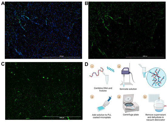 Building off of our group’s previously published chromatin microwebs that have been used as a NET mimetic, we adapted them to be suitable for degradation assays [37]. NET degradation assays require surface attachment of the DNA for ease in solution replacement and wash steps. The microwebs were diluted and centrifuged in poly-L-lysine (PLL)-coated 96-well microplates, so that the webs, now referred to as surface webs, were attached to the bottom of the wells (Figure 1D). The plate was then desiccated to increase its storage stability. This process generated structures (Figure 1C) shaped and distributed similarly to NETs (Figure 1A,B).