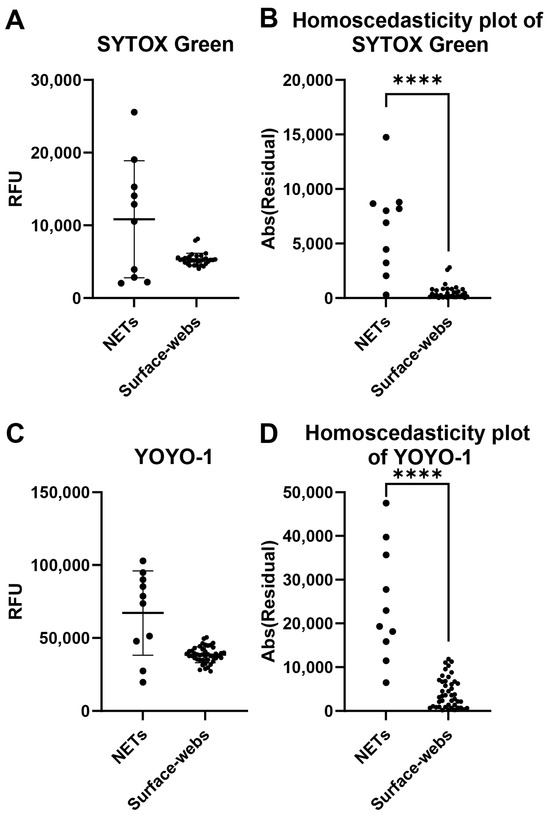 A common problem with NET degradation assay experiments is the well-to-well variability. Several factors may impact the variability, including neutrophil seeding, differences in neutrophil activation levels for NETosis, and remnant nuclear DNA contaminating the wells. We assessed individual well fluorescence readings of NETs and surface webs to compare the well-to-well variability of both (Figure 2). Wells were stained with either SYTOX Green or YOYO-1. The absolute values of the residuals were plotted to create homoscedasticity plots to compare variance (Figure 2B,D). With both dyes, NETs showed significantly higher variability in RFU between wells, thus indicating higher variability of DNA within a microplate compared to a microplate of surface webs.