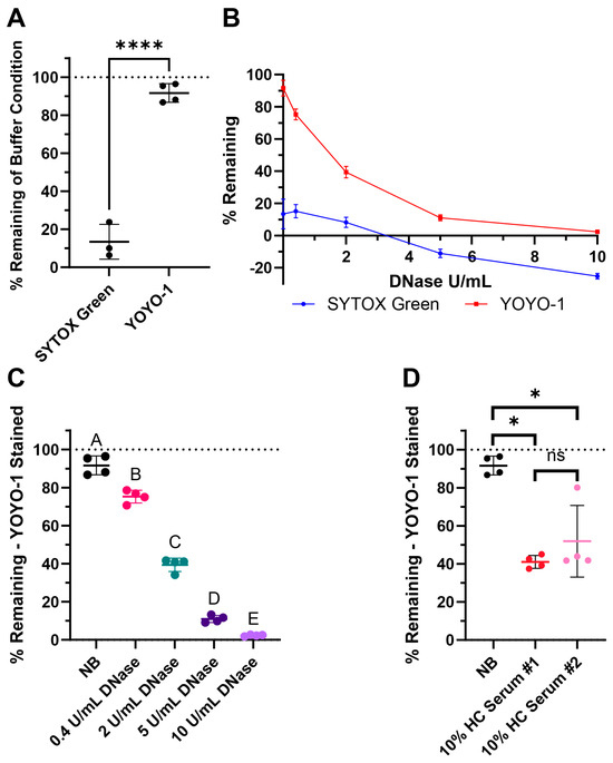 Surface web degradation assay tested with commonly used controls: DNase and pooled healthy control (HC) serum. (A) Comparison of SYTOX Green and YOYO-1 dye persistence with buffer-only conditions after 4 h, where the wells were stained before incubation. (B) DNase I curves from the treatment of 0.4, 2, 5, and 10 Kunitz/mL (U/mL) of DNase showing the possible dynamic range of the assay with respective dyes. (C) Assay results with the nuclease buffer (NB) and DNase I when stained with YOYO-1. (D) Assay results with NB and two pools of healthy control (HC) serum when stained with YOYO-1. (A–D) The line indicates the mean and the bars represent the standard deviation of the samples. (A) Normality testing with Shapiro–Wilk revealed normally distributed data (W = 0.9046, p = 0.3597). Two-sample two-tailed t test. **** p value < 0.0001. (C) Testing with Shapiro–Wilk revealed normally distributed data (W = 0.9517, p = 0.3935). Ordinary one-way ANOVA, followed by Tukey’s post-hoc test. Statistical significance is shown with compact letters, where groups with shared letters indicate p value > 0.05. Adjusted p-values are listed in Table S2. (D) Testing with Shapiro–Wilk revealed non-normally distributed data (W = 0.8001, p = 0.0095). Mann–Whitney test results for exact p values are as follows: between NB and HC Serum #1 * p = 0.0286, NB and HC Serum #2 * p = 0.0286, and HC Serum #1 and #2 p = 0.4857 labeled as not significant (ns). See Appendix A for an explanation of calculations and the existence of negative % remaining.
