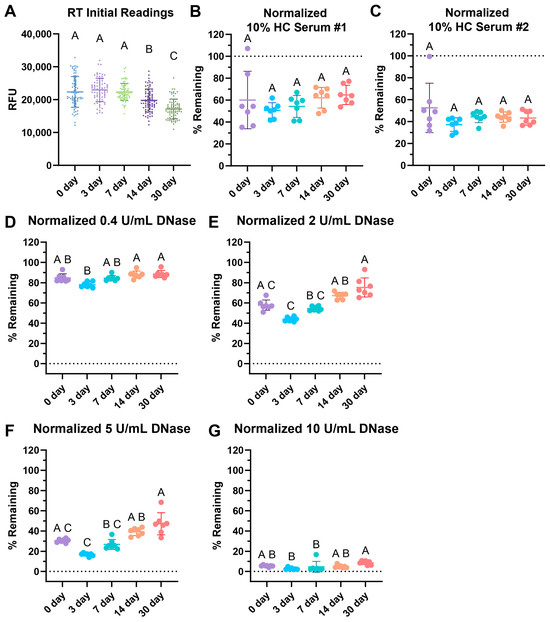 RT storage effects after 3, 7, 14, and 30 days. (A) Comparison of initial fluorescence readings over time, with 77 replicates per condition. Storage effects on (B) 10% healthy serum degradation with pool #1 healthy control (HC) serum, (C) 10% HC serum pool #2 degradation, (D) 0.4 Kuntiz/mL (U/mL) of DNase I. (E) 2 U/mL DNase I, (F) 5 U/mL DNase I, and (G) 10 U/mL DNase degradation. (B–G) Data normalized such that the negative nuclease buffer controls were 100% remaining. (A–G) Sample lines represent the mean and the bars the standard deviation. Kruskal–Wallis with post-hoc Dunn’s test. Statistical significance is shown using a compact letter display as a summary for multiple comparisons, where groups with shared letters indicate p values > 0.05. Adjusted p-values are listed in Tables S3–S9. Shapiro–Wilk testing reveals non-normality for (A) W = 0.9892, p = 0.0062; (B) W = 0.9254, p = 0.0204; (C) W = 0.7729, p < 0.0001; (D) W = 0.8897, p = 0.0021; (E) W = 0.9038, p = 0.0050; (F) W = 0.8294, p < 0.0001; and (G) W = 0.6901, p < 0.0001. See Appendix A for an explanation of calculations and the existence of over 100% remaining.