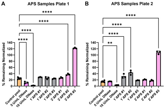 Surface web degradation with primary (1°) and secondary (2°) antiphospholipid syndrome (APS) patient serum. Data were normalized, such that negative nuclease buffer controls were 100% remaining. (A) Patient samples tested 15 days after fabrication. Normality testing with Shapiro–Wilk revealed normally distributed data (W = 0.9893, p value = 0.9246). Ordinary one-way ANOVA with post-hoc Dunnett’s test comparing conditions to the healthy serum control pool revealed significant differences among DNase conditions, 2° APS patient #1, and 2° APS patient #3. **** p value < 0.0001. (B) Patient samples tested 17 days after fabrication. Normality testing with Shapiro–Wilk revealed normally distributed data (W = 0.9470, p = 0.1401). Ordinary one-way ANOVA with post-hoc Dunnett’s test comparing conditions to the healthy serum control pool revealed significant differences among 10 U/mL DNase, 1° APS patient #1, 1° APS patient #2, and 2° APS patient #3. ** p value = 0.0018, **** p value < 0.0001. See Appendix A for an explanation of calculations and the existence of over 100% remaining.
