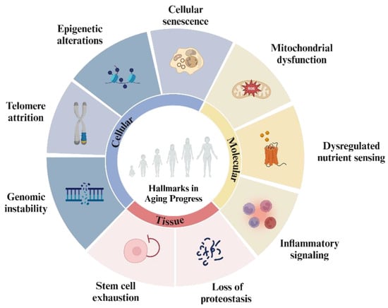 Aging is an inherent biological process characterized by a gradual and irreversible deterioration in many physical functions across all organ systems, primarily caused by the accumulation of damage in response to various stressors. As a result, aging leads to a range of conditions that cause functional decline and increase susceptibility to health complications. The hallmarks of aging-related diseases include a series of interconnected processes that contribute to the gradual breakdown of tissue function and overall health as people age [15]. These hallmarks are broadly classified into tissue, cellular, and molecular mechanisms, which are interrelated and jointly interconnected, and contribute to the overall aging phenotype (Figure 1).