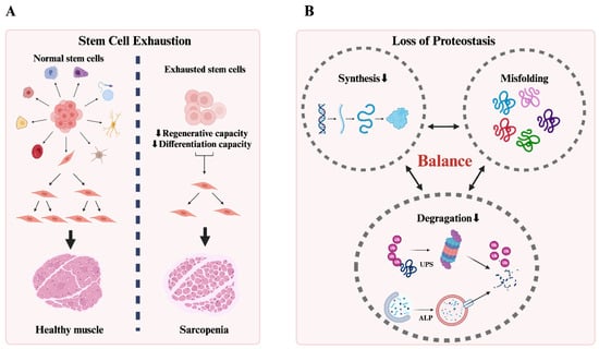 (A) Stem cells and their differentiation and paracrine decline lead to Sarcopenia. (B) Protein homeostasis consists of a regulatory network that controls protein synthesis, folding, and degradation, and once the balance is disrupted it disrupts the integrity and functionality of the proteome. Created with BioRender.com.