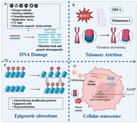 (A) DNA damage can arise from both endogenous sources (e.g., oxidative stress, replication errors) and exogenous sources (e.g., UV radiation, chemicals). The accumulation of DNA damage increases genomic instability and leads to a variety of chronic diseases. (B) Telomeres shorten as cells divide, when telomerase fails to repair them, or due to oxidative damage. (C) When becoming aged, epigenetic patterns deteriorate, leading to a loss of specificity and stochastic changes in gene expression that impair cellular function. (D) As cells continue to divide to their limits, or because of the induction of external stressful pressures, they move into senescence. Created with BioRender.com.