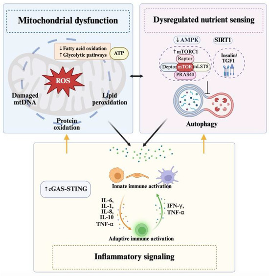 At the molecular level, mitochondrial dysfunction, dysregulated nutrient sensing, and inflammatory signaling are interconnected and together drive the aging process. With aging, mitochondrial function declines, and major ATP production patterns change, while exhibiting abnormalities such as DNA damage, increased inflammation, protein oxidation, and lipid peroxidation. The dysregulation of the nutrient sensing system, particularly the AMPK pathway and SIRT1 pathway, affects metabolism, while alterations in the mTOR pathway and insulin/TGF1 pathway inhibit autophagy. All of the above alterations cause the sustained reciprocal activation of the innate and adaptive immune systems in the environment, which, together with the activation of the cGAS–STING pathway, promote environmental inflammation. Created with BioRender.com.
