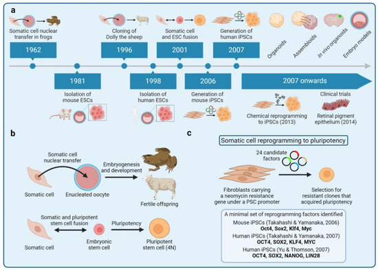 Development of the iPSC technology. Figure from [120], used under a Creative Commons Attribution 4.0 International License. Source: https://www.nature.com/articles/s41392-024-01809-0#Fig1 (accessed on 26 April 2024). The literature mentioned in the figure is from [14,121,122], no copyright issues. Development of the induced pluripotent stem cell (iPSC) technology. (a) A timeline of key breakthroughs related to the iPSC technology. (b) (Top) Somatic cell nuclear transfer (SCNT) experiments were pioneered by John Gurdon in the African clawed frog. Gurdon demonstrated that somatic cells retained all the genetic information necessary to give rise to a germline-competent organism. Successful SCNT in mammals was demonstrated by Keith Campbell, Ian Wilmut, and colleagues who cloned Dolly the sheep. (Bottom) Masako Tada and colleagues demonstrated that pluripotency can also be achieved by fusing a somatic cell with an embryonic stem cell, leading to the formation of a hybrid tetraploid cell. 4N, tetraploid. (c) The groundbreaking experiments of fibroblast reprogramming to pluripotency were pioneered by Kazutoshi Takahashi and Shinya Yamanaka. The researchers selected 24 factors as candidates for reprogramming and delivered these factors into mouse fibroblasts in various combinations by retroviral transduction. Eventually, Takahashi and Yamanaka identified a combination of 4 reprogramming factors—Oct4, Sox2, Klf4, and Myc—that was sufficient to reprogram mouse fibroblasts into embryonic stem cell-like pluripotent cells, known as iPSCs. Subsequently, Yamanaka and James Thomson independently reprogrammed human fibroblasts into iPSCs in 2007.