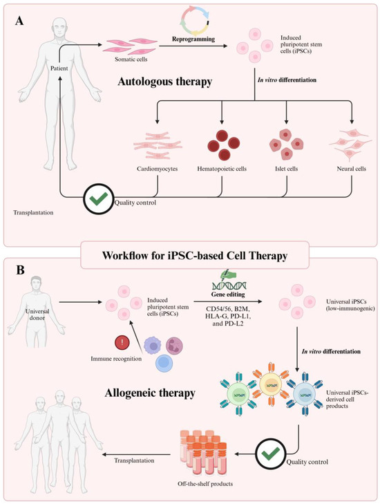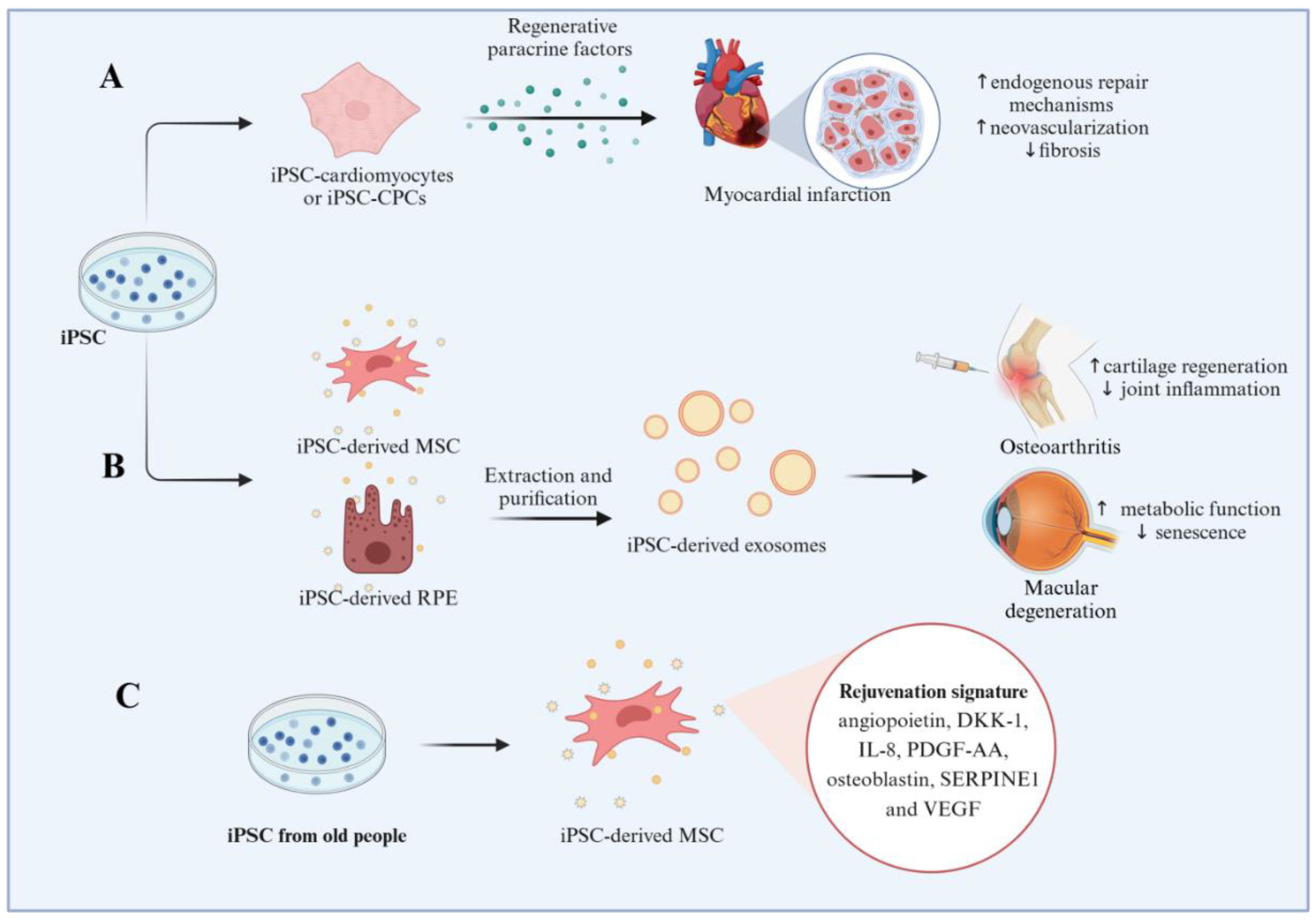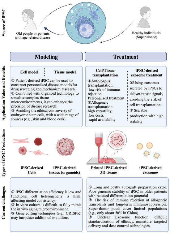 However, the heterogeneity of aging manifestations makes it difficult to pinpoint specific mechanisms and develop targeted medical interventions, and thus a diverse range of therapeutic interventions is still being explored and developed, including stem cell therapy. Stem cell theory is a broad concept in biology and medicine that revolves around many unique properties and functions of stem cells, which are undifferentiated cells capable of dividing and differentiating into specialized cell types [10,11]. This theory has significant implications across various fields, including regenerative medicine, cancer biology, and developmental biology. However, traditional stem cell therapies still face some obstacles, including ethical concerns, immunological rejection, restricted cell source availability, and limited differentiation potential [12]. In recent years, active research has focused on iPSCs, which are a type of stem cell that can be generated directly from adult cells. This groundbreaking technology, first demonstrated by Shinya Yamanaka and colleagues in 2006, involves reprogramming adult somatic cells into a pluripotent state by introducing specific transcription factors [13,14]. iPSCs possess a unique ability to differentiate into a wide array of cell types, making them invaluable for creating models of human aging diseases and for testing potential therapeutic interventions [12]. Furthermore, their capacity for patient-specific derivation allows for the exploration of genetic and environmental factors that contribute to individual aging processes and disease susceptibilities [12].