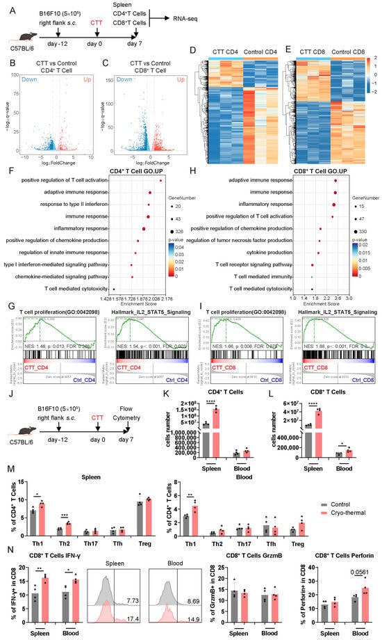CD4+ and CD8+ T cells were activated and proliferated at an early stage after CTT. (A) Scheme of the experiment design. The splenic CD4+ and CD8+ T cells were isolated on day 7 after CTT by MACS for RNA-seq. (B,C) Volcano plot showing DEGs in (B) CD4+ and (C) CD8+ T cells from the control or CTT group. (D,E) Heatmap of differentially expressed genes in (D) CD4+ and (E) CD8+ T cells from the control or CTT group. (F) Scatter plot of the GO-enriched gene sets according to GSEA in CD4+ T cells. (G) Gene enrichment of T cell proliferation and IL2–STAT5 signaling pathways according to GSEA in CD4+ T cells. (H) Scatter plot of the GO-enriched gene sets according to GSEA in CD8+ T cells. (I) Gene enrichment of T cell proliferation and IL2–STAT5 signaling pathways according to GSEA in CD8+ T cells. (J) Scheme of the experiment design. The phenotype of CD4+ and CD8+ T cells was detected by flow cytometry on day 7 after CTT. (K,L) Absolute number of (K) CD4+ and (L) CD8+ T cells in the spleen and blood. (M) Subsets of CD4+ T cells in the spleen and blood. (N) IFN-γ, granzyme B, and perforin expression in CD8+ T cells in the spleen and blood. All of the data are presented as the means ± SD. n = 4 for flow cytometry and n = 3 for RNA-seq. * p < 0.05, ** p < 0.01, *** p < 0.001, **** p < 0.0001. Data for graphs were calculated by Student’s t-test.